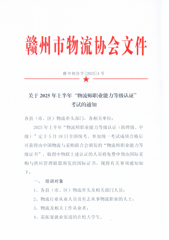 2025年上半年“物流師職業(yè)能力等級認證(助理級、中級)”定于5月18日全國統(tǒng)考。參加統(tǒng)一考試成績合格后可獲得由中國物流與采購聯(lián)合會頒發(fā)的“物流師職業(yè)能力等級證書”,取得中物聯(lián)上述認證的人員將免費申領由國際采購與供應管理聯(lián)盟頒發(fā)的國際證書。現(xiàn)將有關事項通知如下: