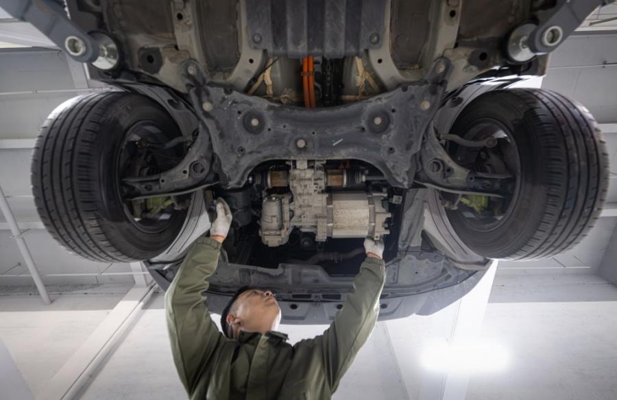 12月5日,一名新能源汽車維修師在檢查一輛新能源汽車的電機(jī)。新華社記者 肖藝九 攝