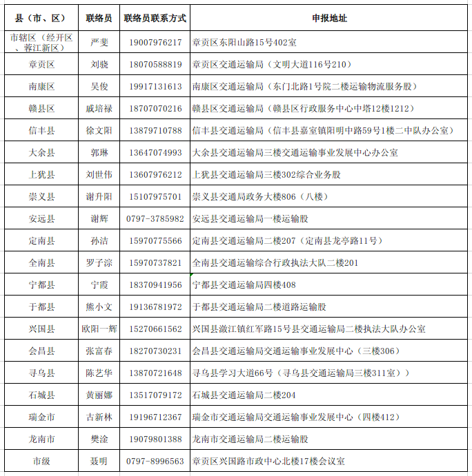 以下為各縣(市、區)交通運輸部門負責老舊營運貨車報廢更新工作的聯系人,申請人如需咨詢政策、查詢申報進度可向車籍所屬縣級交通運輸主管部門咨詢。