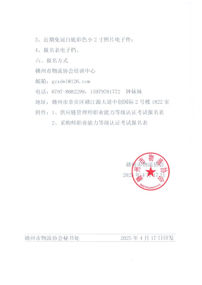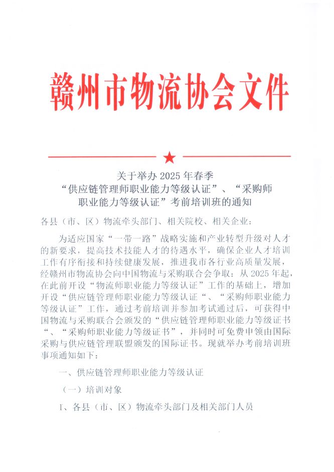為適應國家“一帶一路”戰略實施和產業轉型升級對人才的新要求,提高技術技能人才的待遇水平,確保企業人才培訓工作有序銜接和持續健康發展,推進我市各行業高質量發展,經贛州市物流協會向中國物流與采購聯合會爭取:從2025年起,在此前開設“物流師職業能力等級認證”工作的基礎上,增加開設“供應鏈管理師職業能力等級認證“、“采購師職業能力等級認證”工作,通過考前培訓并參加考試通過后,可獲得中國物流與采購聯合會頒發的“供應鏈管理師職業能力等級證書“、“采購師職業能力等級證書”,并同時可免費申領由國際采購與供應鏈管理聯盟頒發的國際證書。現就舉辦考前培訓班事項通知如下: